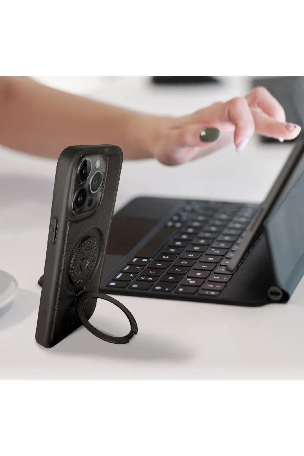 Kılıfın ortasında yer alan mıknatıslı halka yapısı, MagSafe aksesuarlarıyla tam uyumludur. Kablosuz şarj cihazlarıyla uyumlu çalışır, bağlantıyı güçlendirir ve hızlı şarj sürecine katkı sağlar.