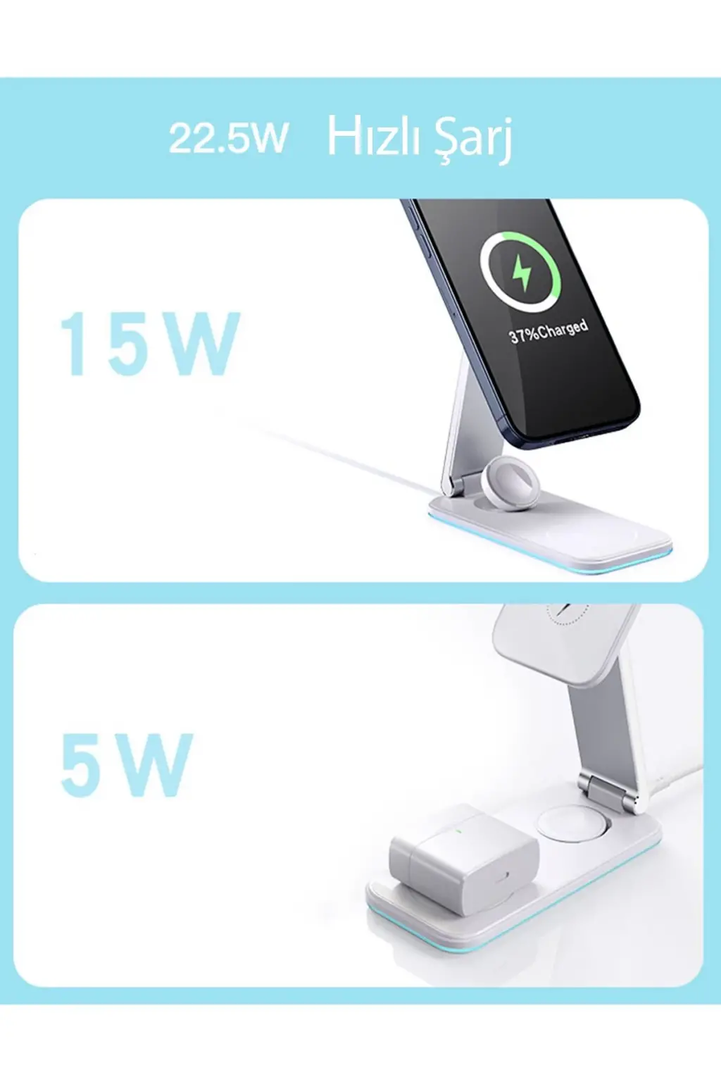 Bu şarj standı, hızlı kablosuz şarj özelliği ile donatılmıştır. Uyumlu cihazlarınızı hızlı bir şekilde şarj ederek, günlük kullanımda zaman kazanmanızı sağlar. Cihazlarınızın şarj ihtiyacını karşılamak için tek yapmanız gereken, cihazınızı şarj standına yerleştirmektir.