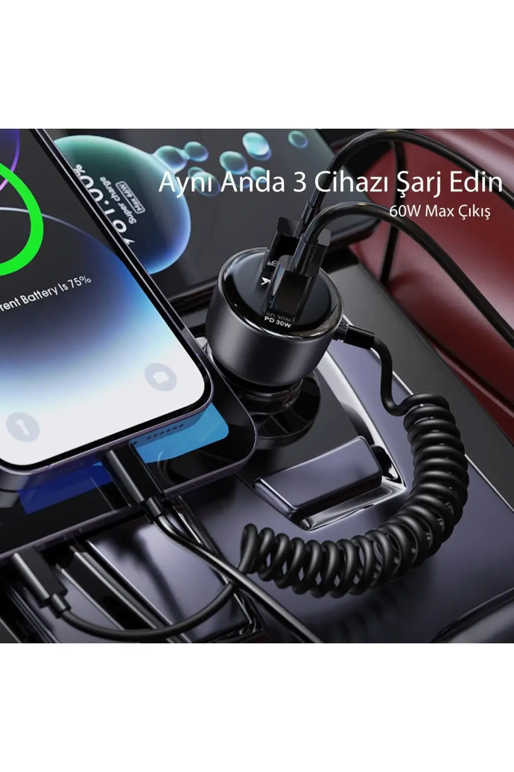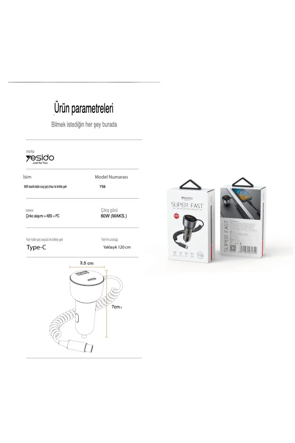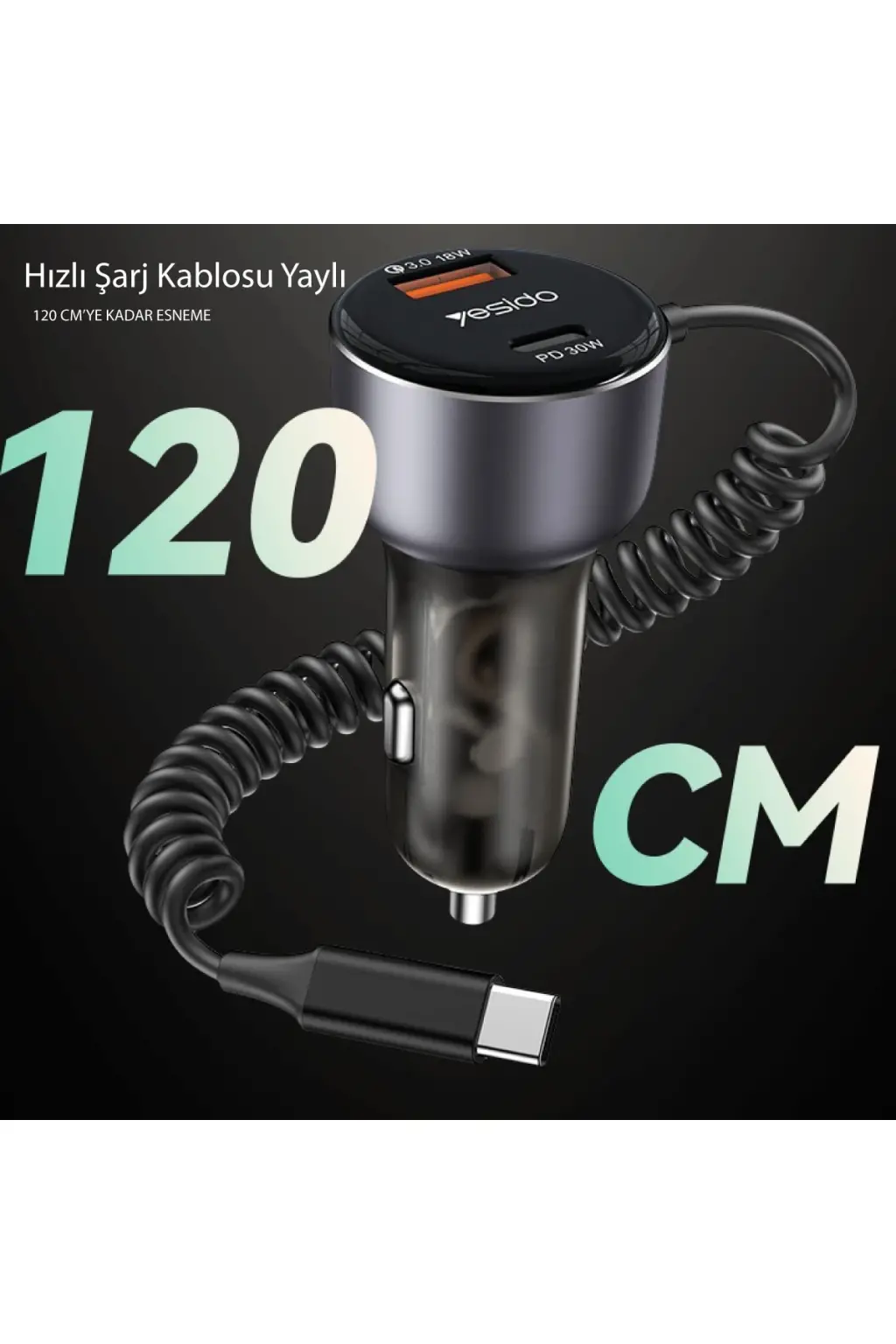 Yesido Y56 1 Adet 18W Usb / 1 Adet 30W Type-C ve 30W Dahili Type-C Kablolu PD Hızlı Araç Şarj