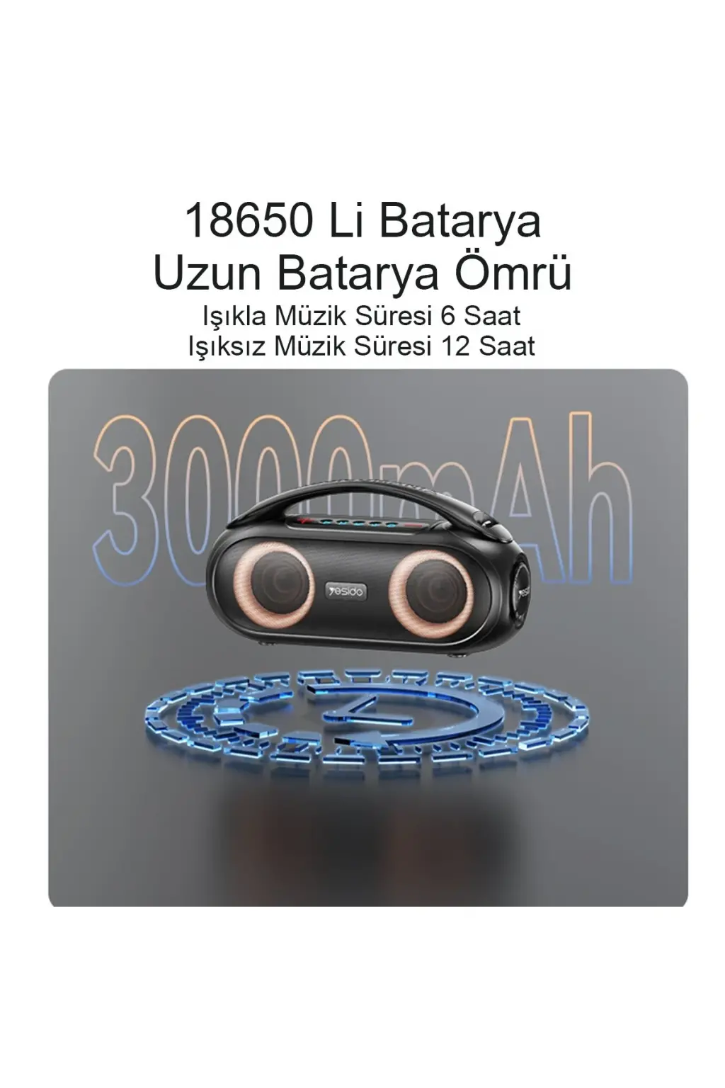 Her bir hoparlörde bulunan 3000 mAh kapasiteli lityum iyon batarya, uzun süreli kullanım imkanı sunar. Tam şarj ile uzun saatler boyunca kesintisiz müzik dinleyebilir, partilerin ve etkinliklerin keyfini çıkarabilirsiniz.
